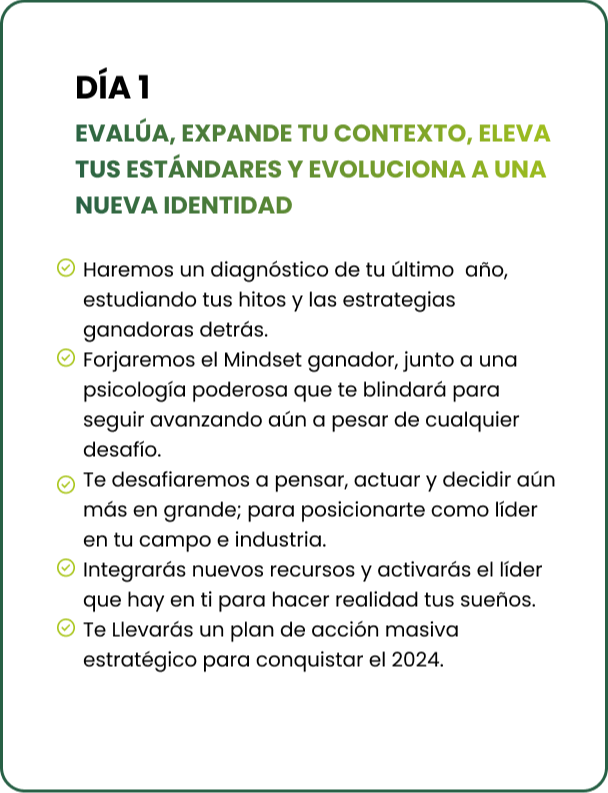 Esta es una inmersión presencial donde durante 2 días recibirás entrenamiento directo sobre como PENSAR EN GRANDE y FIJAR TUS OBJETIVOS que le darán sentido a tu vida este 2024.